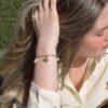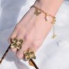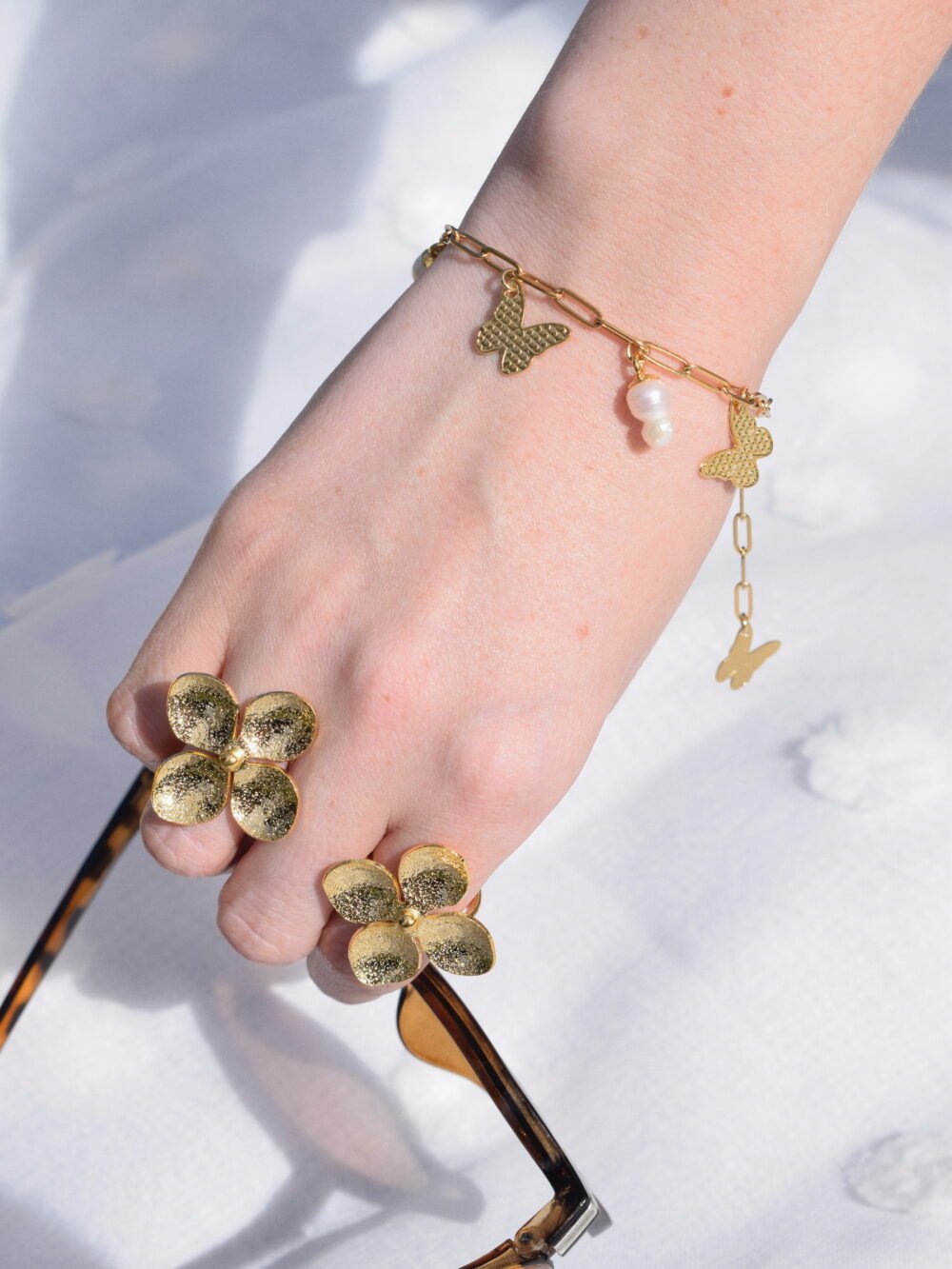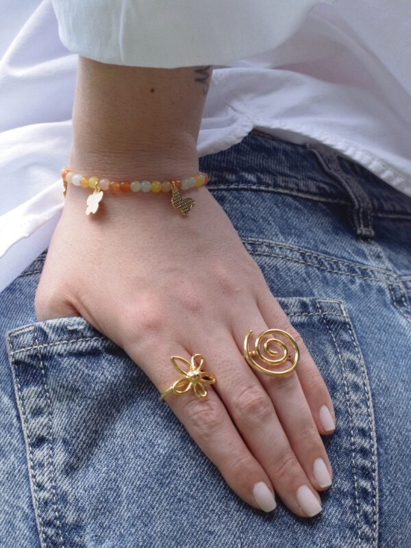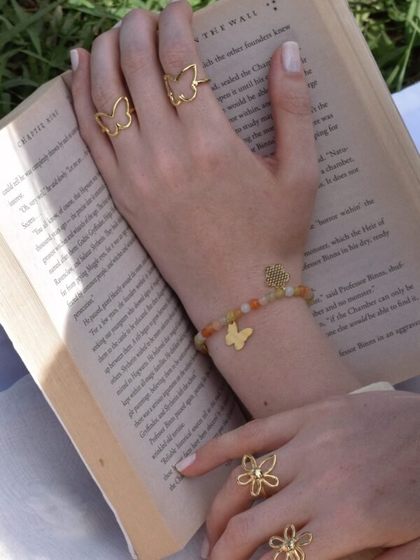 Dijes flor, mariposa martillada en bronce con baño de oro (3) Ágatas tonos jardín Argollas y broche en acero inoxidable longitud: