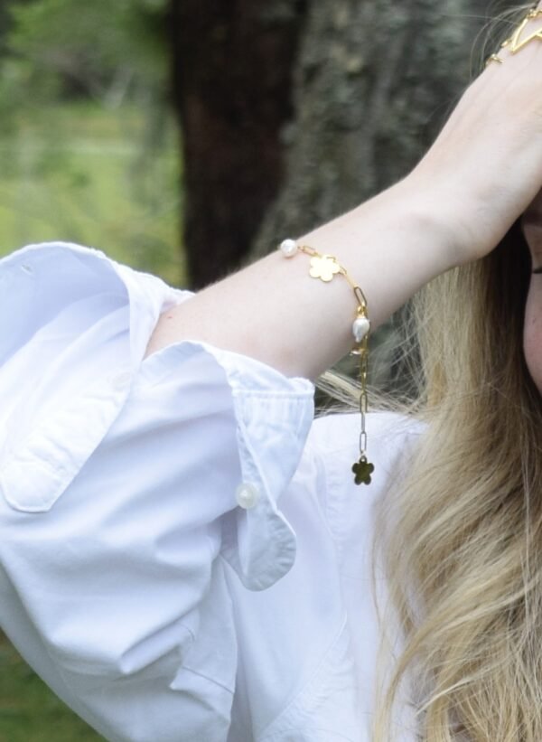 Dije perlas baroque con campanitas en bronce con baño de oro (3) Dijes flores martilladas en bronce con baño de oro